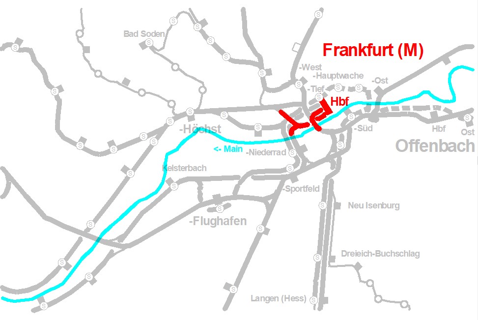 - Der gesamte S-Bahn-Verkehr wobei die Strecke nach Frankfurt(M) West bereits im Tiefbahnhof abzweigt und dem Stellbereich Frankfurt Hauptwache zugeordnet ist.