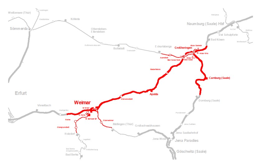 • (Bebra – Erfurt Hbf) – Weimar – Großheringen – Naumburg Hbf – (Halle/Leipzig)