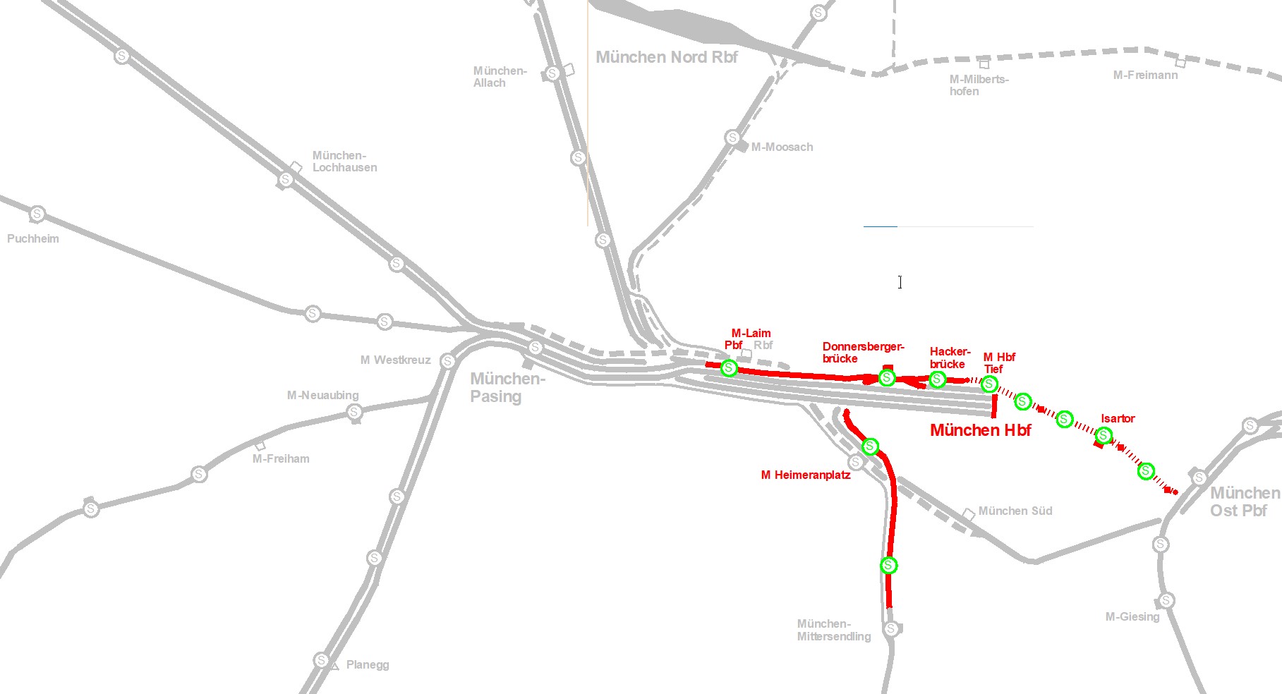 • (M-Ost S) – M-Isartor – M-Hbf Tiefbf – M-Donnersberger Brücke – M-Laim – (M-Pasing)